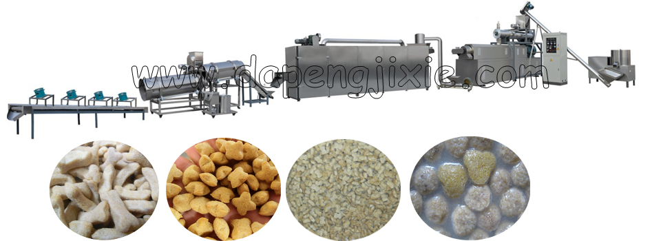 3. This line consists of raw material mixer, double-screw extruder, air blower, dryer and flavoring machine.